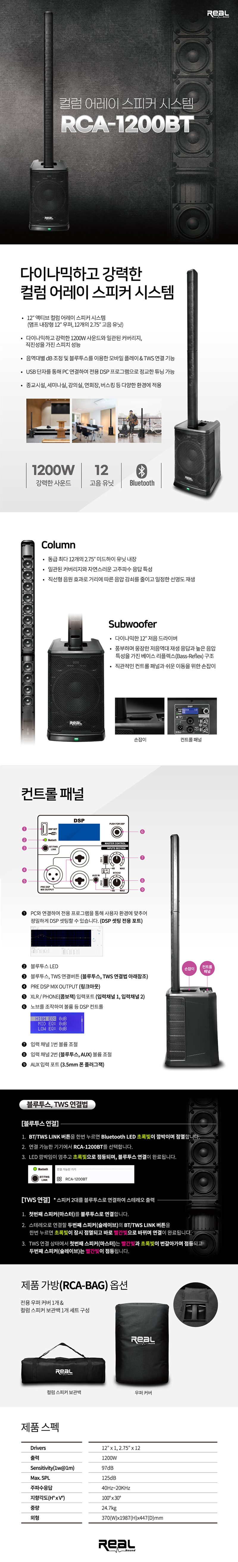 REAL RCA1200BT 컬럼어레이 스피커 시스템 12인치 우퍼