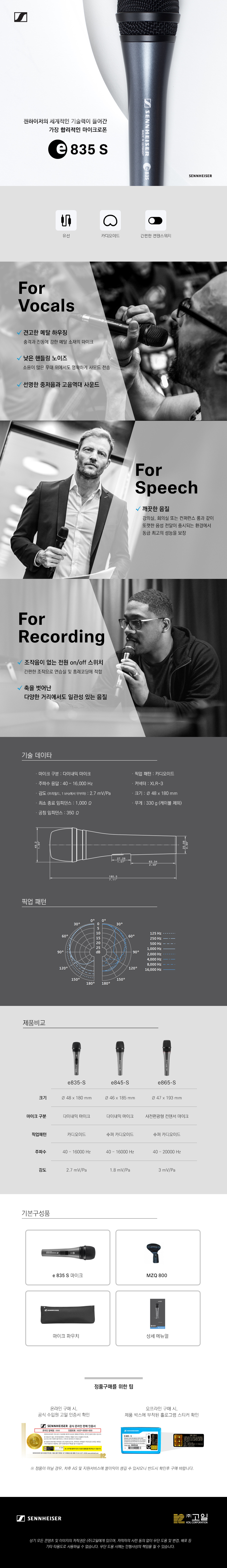 젠하이저 E835S E835-S 학교 교회 입문용 보컬용 마이크 카디오이드 다이나믹 마이크 케이블 패키지